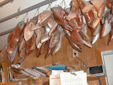 In many shops, you'll see the walls lined with shelves and shelves of boot lasts. Lee's got his hanging from the ceiling. The customer's name is written on the bottom of each pair...some names I even recognized...Daryl Hall, Slim Pickens...and even Austin boot collector, John Tongate.